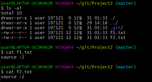 현재 버전 관리 중인 f1.txt와 f2.txt의 내용이 source : 2로 되돌아간 것을 알 수 있습니다.