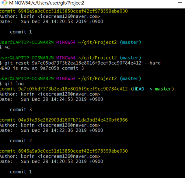 git reset commit3고유값 --hard 명령어를 입력해줍시다.