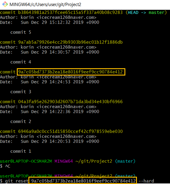즉, commit 5와 commit 4를 삭제하고 commit 3을 제일 최신 상태로 놔두고 싶은 경우 어떻게 해야할지 알아봅시다.