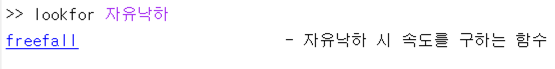 lookfor 키워드 를 입력하면 키워드와 관련이 있는(설명주석에 키워드가 있는) 함수가 함수 설명가 함께 나타난다.
