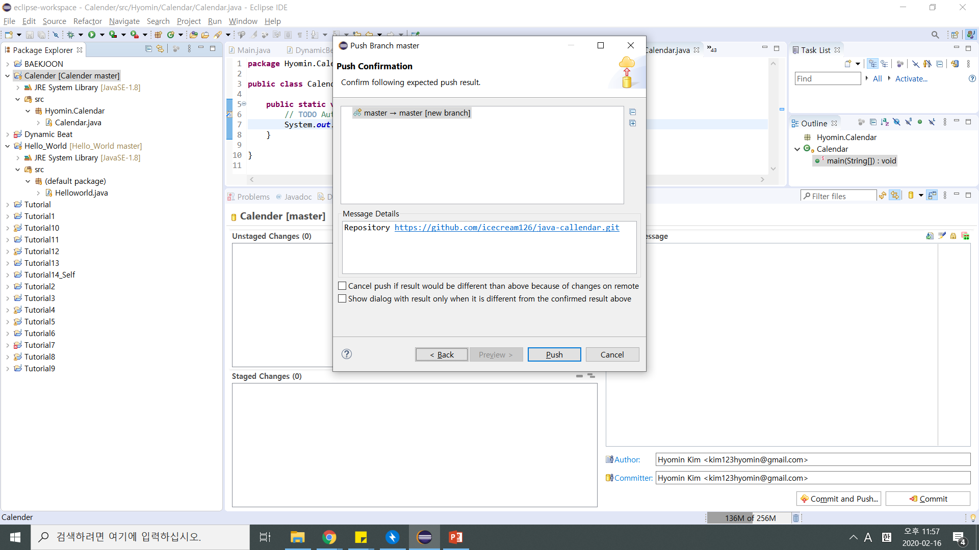 프로젝트 우클릭 -> Team -> Push Branch master (Push가 로컬 저장소에 있는걸 Github로 올린다는 뜻)