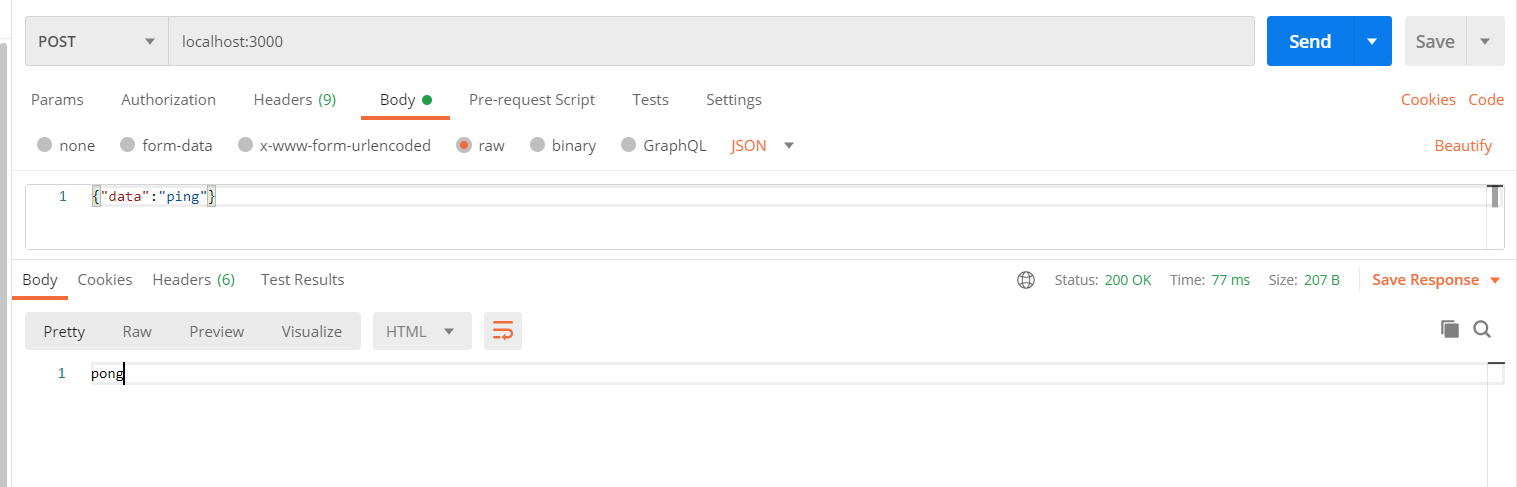 목표 : 사용자가 Ping이라는 data를 보내면 서버에서 pong이라는 respond를 보내기 const express = require('express') const app = express() const port = 3000 const bodyParser=require('body-parser') app.use(bodyParser.json()) app.use(bodyParser.urlencoded({extended:true})) app.post('/',function(req,res){ const {data} = req.body if(data==='ping'){ console.log(req.body) res.status(200).send('pong') return } console.log(req.bod..